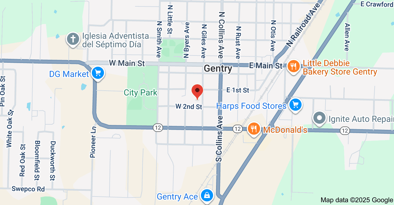 1. From AR 59 in Gentry, turn West onto E. 3rd St/HWY 112.